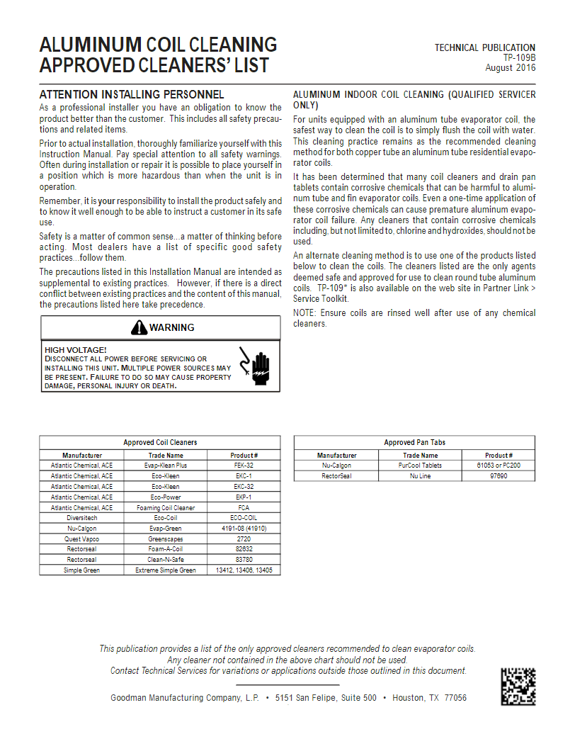 TP-109B: Aluminum Coil Cleaning Approved Cleaners' List Nick Lehman March 14, 2023 14:46 TP-109B Aluminum Coil Cleaning Approved Cleaners' List.pdf 20 KB Download Related articles Air Handler & Coil Start Up Sheet Condenser / Heat Pump / Inverter Start Up Sheet TP-110 R-32 Long Line Set Application Residential Package Unit Start Up Sheet TP-107O: LONG LINE SET APPLICATION Comments 0 comments Article is closed for comments.