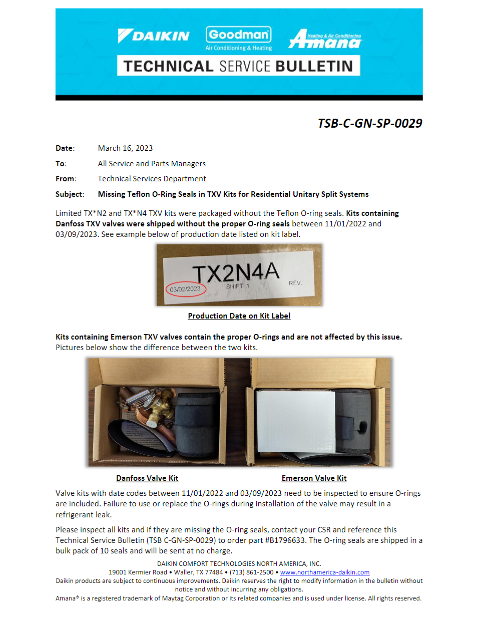 The Daikin Marketing department is providing you with this important product service information. This Technical Service Bulletin has been distributed to Daikin personnel, company owned distribution (COD), non-company owned distribution (IND), and manufacturer representatives (REP).