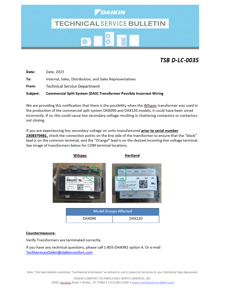 TSB D-LC-0035 Commercial Split System (DAX) Transformer Possible Incorrect Wiring Nick Lehman October 10, 2023 12:02 Updated TSB D-LC-0035 Commercial Split System (DAX) Transformer Possible Incorrect Wiring.pdf 200 KB Download Comments 0 comments Article is closed for comments.