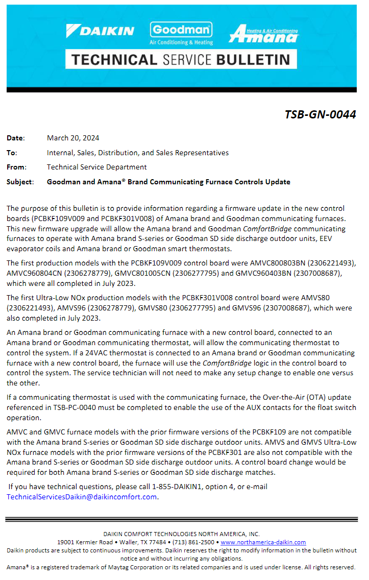 TSB-GN-0044 Goodman and Amana® Brand Communicating Furnace Controls Update Nick Lehman April 04, 2024 15:36 Updated TSB-GN-0044 Goodman and Amana® Brand Communicating Furnace Controls Update.pdf 200 KB Download Related articles TSB D-PC-0040 AUX Contacts on Communicating Furnaces Amana/Goodman ComfortNet/ComfortBridge Reference Sheet Daikin One Thermostat Menu Options TSB C-GN-OT-0083 RDS Control and Sensor Troubleshooting TP-110 R-32 Long Line Set Application Comments 0 comments Article is closed for comments.