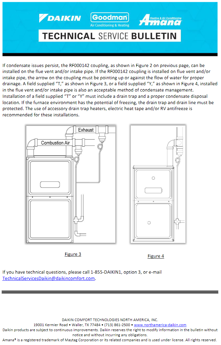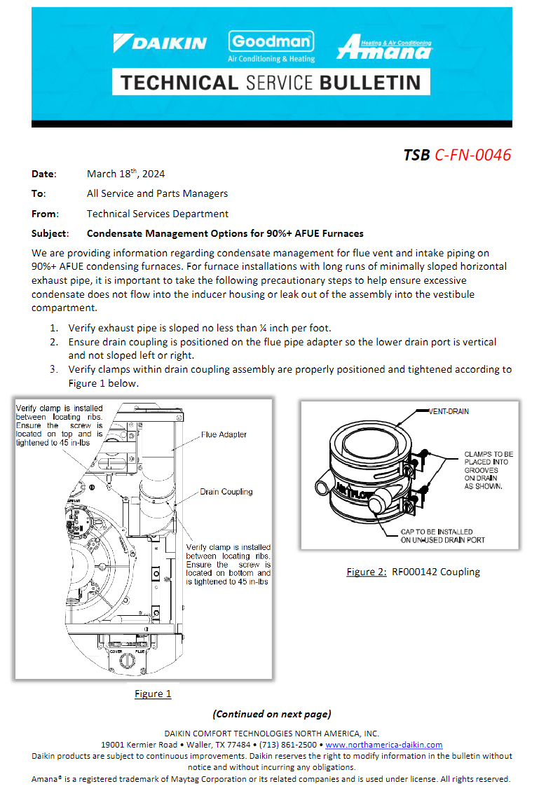 TSB C-FN-0046 Condensate Management Options for 90%+ AFUE Furnaces Nick Lehman April 04, 2024 15:32 Related to TSB Technical Service Bulletin TSB C-FN-0046 Condensate Management Options for 90%+ AFUE Furnaces.pdf 400 KB Download Related articles TSB C-FN-0045 Additional Exhaust and Intake Termination Options for 90%+ AFUE Furnaces Issue with Condensate bypassing Drain Elbows on Goodman Condensing Furnaces TSB C-GN-FN-0089 90+ Furnaces – Pressure Switch Changes TSB C-GN-FN-0062 New Combustion Air Coupling for 80% Furnaces TSB C-GN-OT-0087 R-32 Compliant Communicating Furnace Updates Comments 0 comments Article is closed for comments.