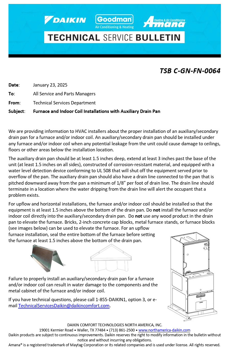 TSB C-GN-FN-0064 Furnace and Indoor Coil Installations with Auxiliary Drain Pan Nick Lehman March 14, 2025 13:01 Related to TSB Technical Service Bulletin TSB C-GN-FN 0064 Furnace and Indoor Coil Installations with Auxiliary Drain Pan.pdf 200 KB Download Related articles TSB C-GN-FN-0089 90+ Furnaces – Pressure Switch Changes TSB C-GN-OT-0083 RDS Control and Sensor Troubleshooting TSB C-GN-OT-0075 REV1 REVISION Furnace Integration Kit with Float Switch Wiring Improvement Comments 0 comments Article is closed for comments.