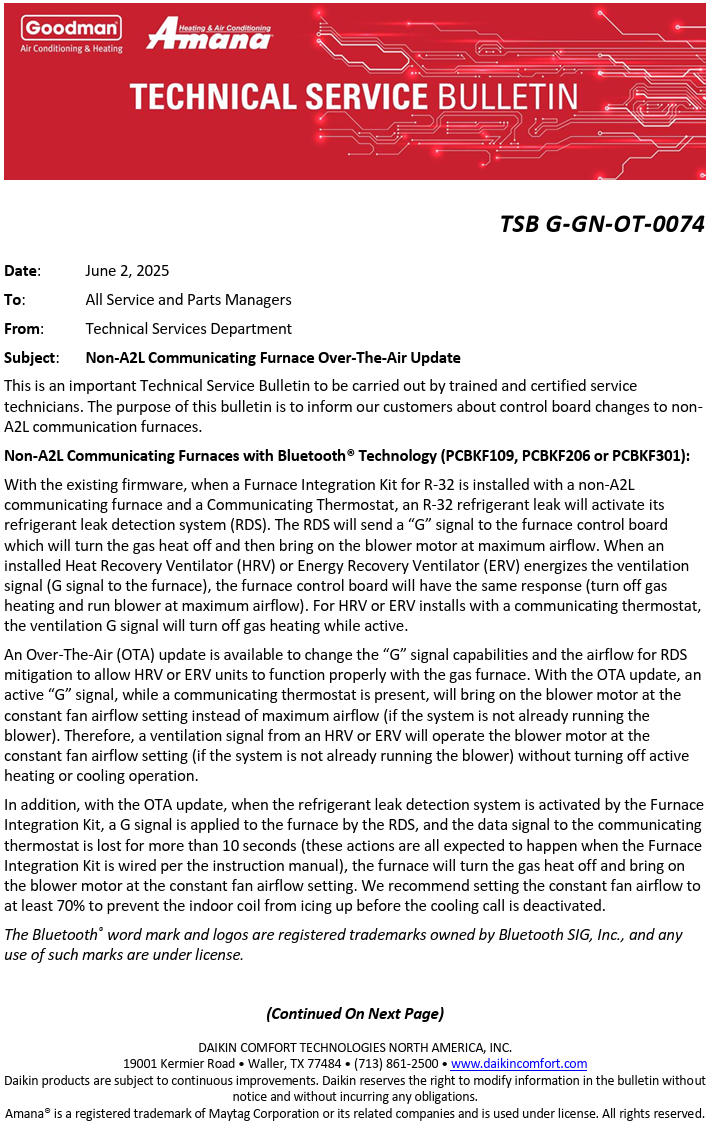 TSB G-GN-OT-0074 Non-A2L Communicating Furnace Over-The-Air Update Nick Lehman June 04, 2025 15:50 Related to TSB Technical Service Bulletin TSB G-GN-OT-0074 Non-A2L Communicating Furnace Over-The-Air Update.pdf 300 KB Download Related articles TSB C-GN-OT-0078 Before Replacing the Furnace Control Board: Troubleshooting Error Codes TSB C-GN-OT-0085 Charging 2-stage ODUs TSB C-GN-OT-0087 R-32 Compliant Communicating Furnace Updates TSB C-GN-OT-0069 Accessory/Zoning Kit for R-32 Systems Comments 0 comments Article is closed for comments.