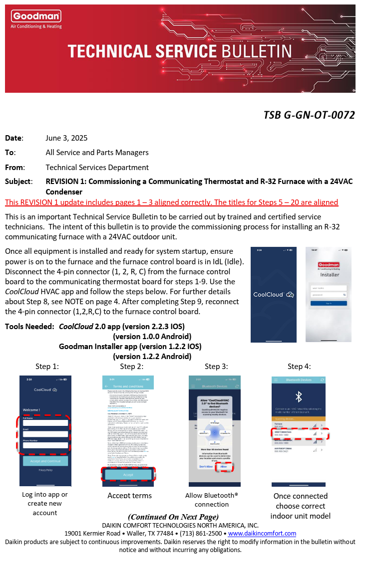 TSB G-GN-OT-0072 REV1 REVISION Commissioning a Communicating Thermostat and R-32 Furnace with a 24VAC Condenser - Goodman Nick Lehman June 04, 2025 15:53 Related to TSB Technical Service Bulletin Related articles TSB D-GN-OT-0073 REV1 REVISION Commissioning a Communicating Thermostat and R-32 Furnace with a 24VAC Condenser - Daikin Comments 0 comments Article is closed for comments.