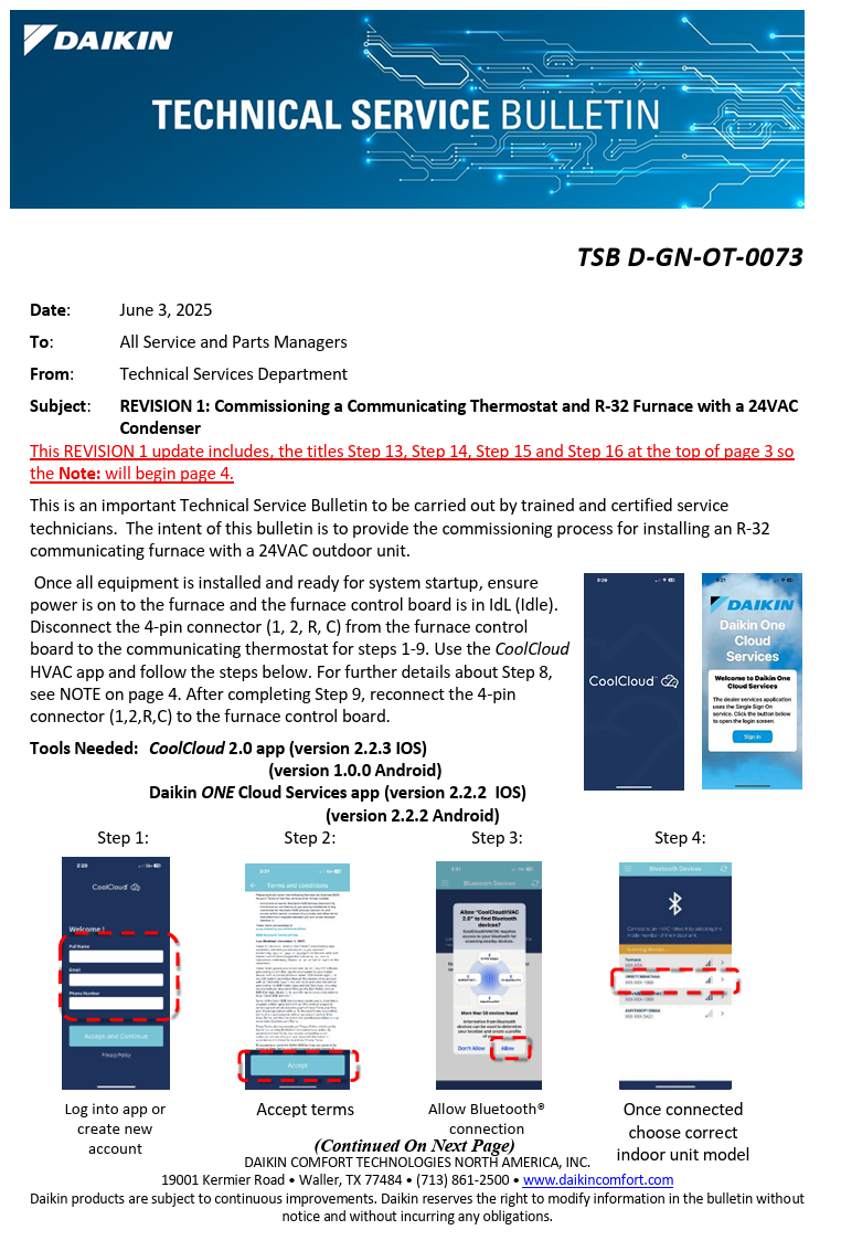 TSB D-GN-OT-0073 REV1 REVISION Commissioning a Communicating Thermostat and R-32 Furnace with a 24VAC Condenser - Daikin Nick Lehman June 04, 2025 15:52 Related to TSB Technical Service Bulletin TSB D-GN-OT-0073 REV1 REVISION Commissioning a Communicating Thermostat and R-32 Furnace with a 24VAC Condenser.pdf 800 KB Download Comments 0 comments Article is closed for comments.