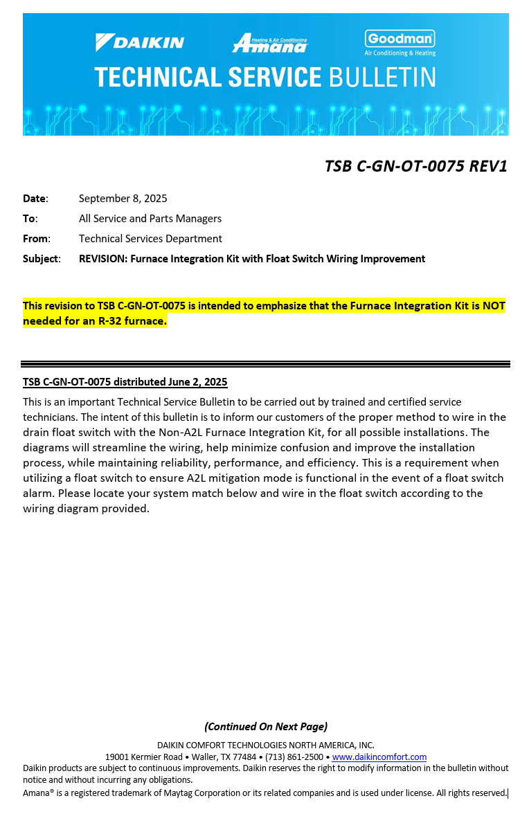 TSB C-GN-OT-0075 REV1 REVISION Furnace Integration Kit with Float Switch Wiring Improvement Nick Lehman September 08, 2025 14:55 Related to TSB Technical Service Bulletin TSB C-GN-OT-0075 REV1 REVISION Furnace Integration Kit with Float Switch Wiring Improvement.pdf 1 MB Download Related articles TSB C-GN-OT-0078 Before Replacing the Furnace Control Board: Troubleshooting Error Codes Comments 0 comments Article is closed for comments.