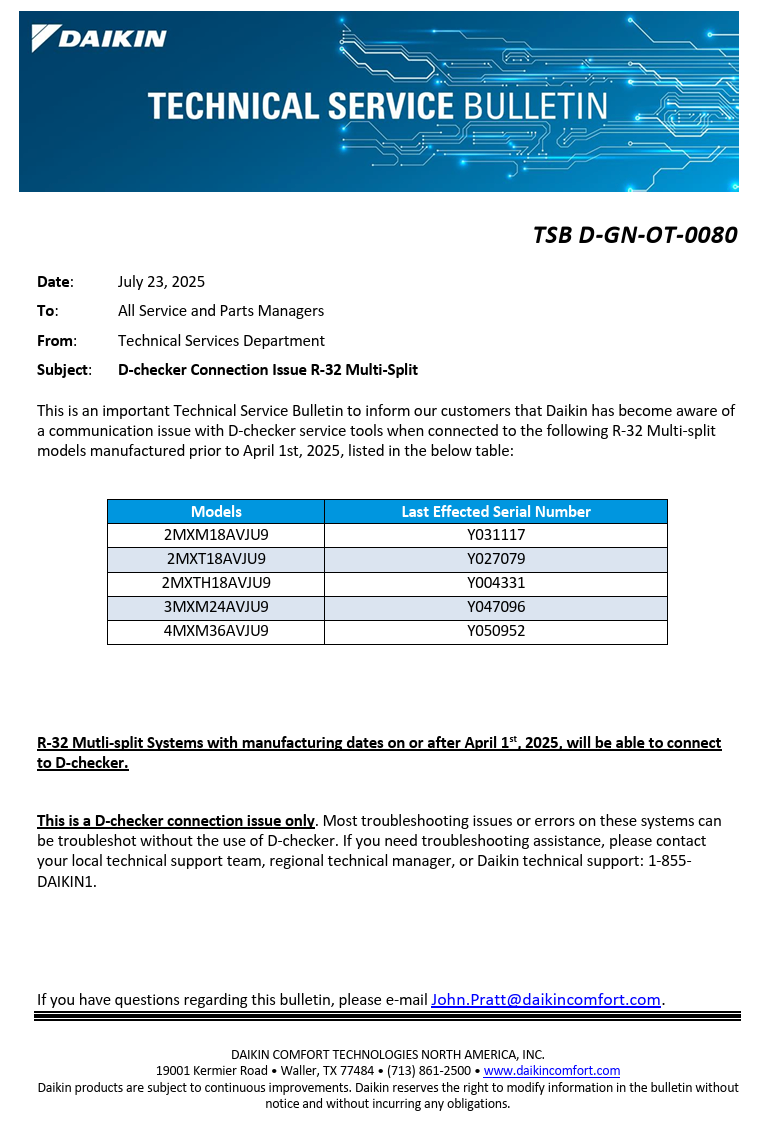 TSB D-GN-OT-0080 D-checker Connection Issue R-32 Multi-Split Nick Lehman September 08, 2025 15:10 Related to TSB Technical Service Bulletin TSB D-GN-OT-0080 D-checker Connection Issue R-32 Multi-Split.pdf 200 KB Download Related articles TSB C-GN-OT-0085 Charging 2-stage ODUs How to Disable the R-32/A2L Sensor for R-32 Furnaces being installed with R-410A Equipment TSB C-GN-FN-0060 Furnace Twinning for R-32 Systems Comments 0 comments Article is closed for comments.