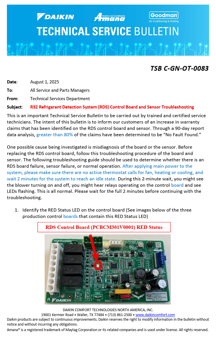 TSB C-GN-OT-0083 RDS Control and Sensor Troubleshooting Nick Lehman September 08, 2025 15:16 Related to TSB Technical Service Bulletin TSB C-GN-OT-0083 RDS Control and Sensor Troubleshooting.pdf 600 KB Download Related articles TSB A-GN-OT-0082 AHVE heat kit Mis-Wiring Amana How to Disable the R-32/A2L Sensor for R-32 Furnaces being installed with R-410A Equipment TSB C-GN-OT-0085 Charging 2-stage ODUs TSB D-GN-MS-0084 Daikin ONE Family of Thermostats Not Compatible with Certain Ductless Wall Mount Units TP-110 R-32 Long Line Set Application Comments 0 comments Article is closed for comments.
