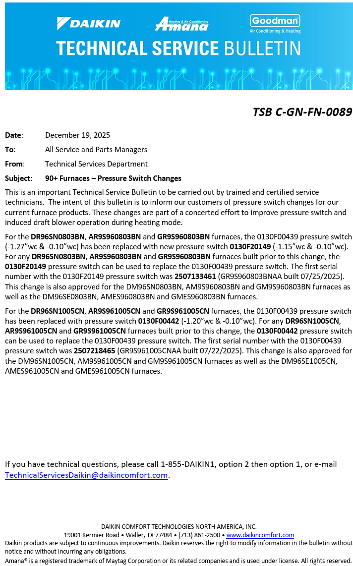 TSB C-GN-FN-0089 90+ Furnaces – Pressure Switch Changes Nick Lehman December 19, 2025 17:05 Related to TSB Technical Service Bulletin TSB C-GN-FN-0089 90+ Furnaces – Pressure Switch Changes.pdf 200 KB Download Related articles TSB C-NP-FN-0059 New Flue Elbow for 90+% Upflow Furnaces for Improved Condensation Management TSB C-GN-OT-0083 RDS Control and Sensor Troubleshooting TSB C-FN-0046 Condensate Management Options for 90%+ AFUE Furnaces TSB C-GN-OT-0087 R-32 Compliant Communicating Furnace Updates TSB C-GN-OT-0085 Charging 2-stage ODUs Comments 0 comments Article is closed for comments.